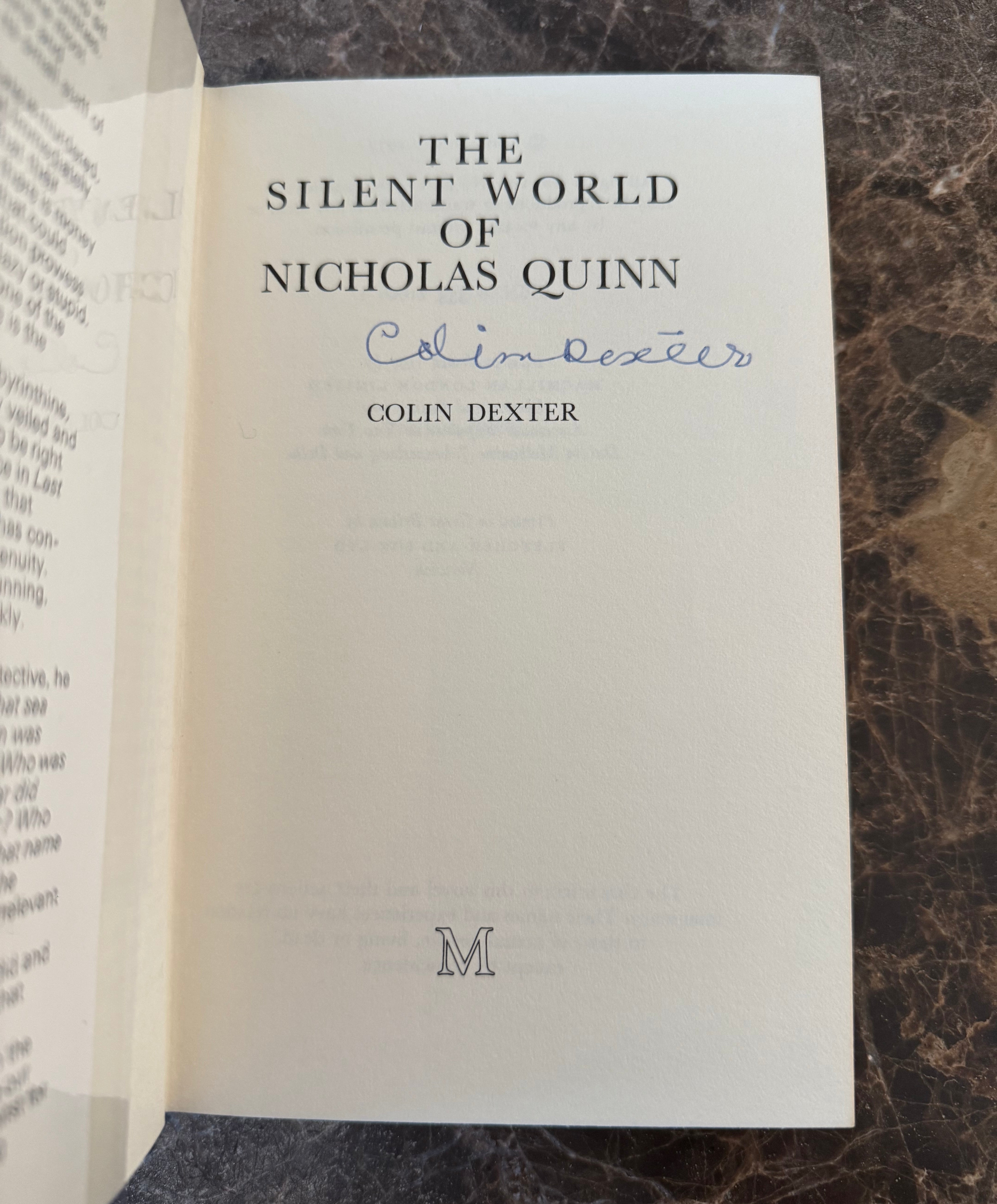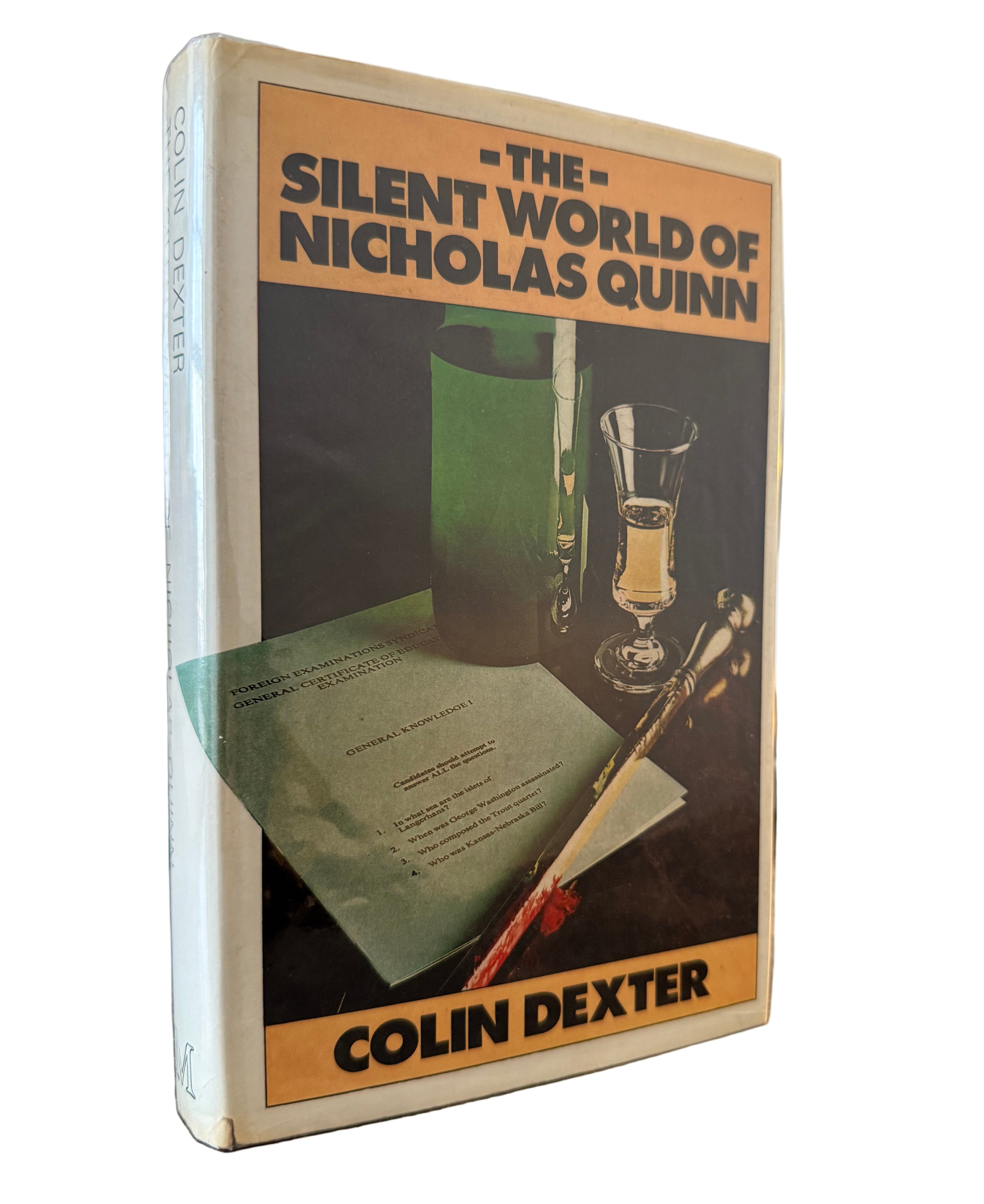 First edition of The Silent World of Nicholas Quinn, published by Macmillan in 1977, signed by Colin Dexter on the title page. The third instalment in the Morse series, set within the Oxford Examination Syndicate, and the first of Dexter’s novels to be adapted for television.